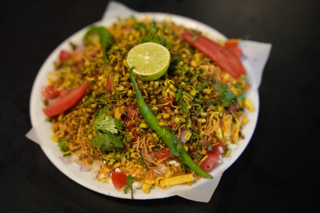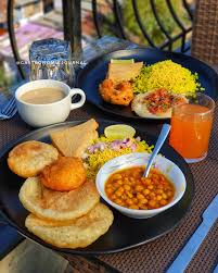 अस्सल महाराष्ट्रीयन राव मिसळची स्वादिष्ट आणि आकर्षक सर्व्हिंग. चमचाभर लालसर, तिखट–मसालेदार रस्सा स्टीलच्या छोट्या बकेटमध्ये दिला आहे, जो मिसळीचा खरा आत्मा मानला जातो. सोबत कुरकुरीत फरसाणाने भरलेली मिसळ, वर पिळण्यासाठी लिंबू, बारीक चिरलेला कांदा आणि ताजी कोथिंबीर—या सर्वांमुळे चवीला एकदम परफेक्ट संतुलन येते. बाजूला मऊ, सोनसळी भाजलेले पाव जे प्रत्येक घासाला अधिक खास बनवतात. छोट्या माठात दिलेली ताजी दही, तिखटपणाला हलके मंदावते आणि थाळीला पूर्णता देते. स्वच्छ, आकर्षक पेशकश आणि अस्सल स्वाद अशी ही थाळी मनाला भावणारी आहे.
